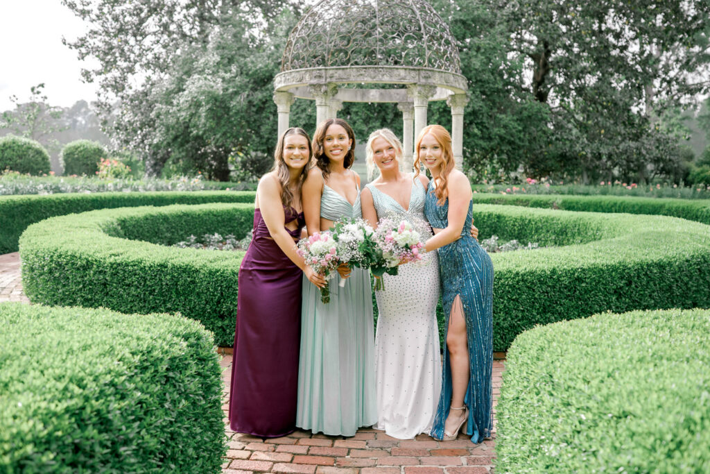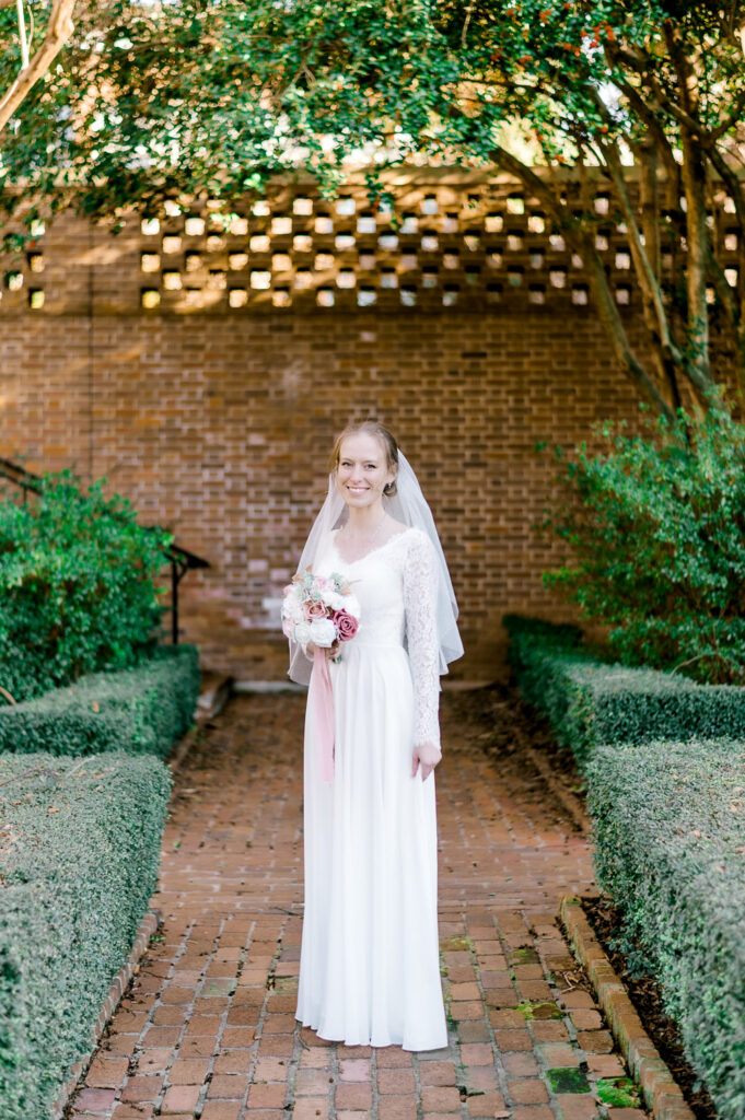 I’ve had the chance to photograph a handful of bridal portraits here, and the combination of structured hedges, soft blooms, and a soft wedding gown with florals creates almost an ‘English courtyard’ feel.