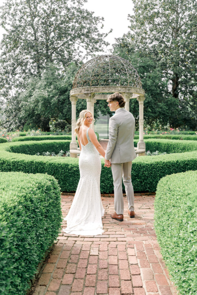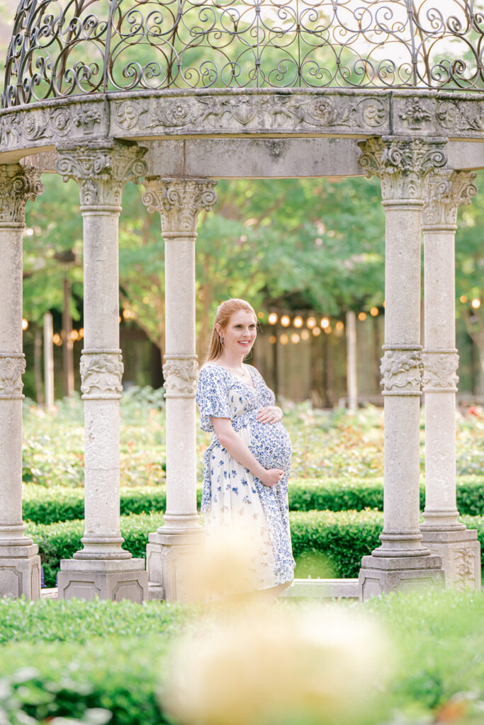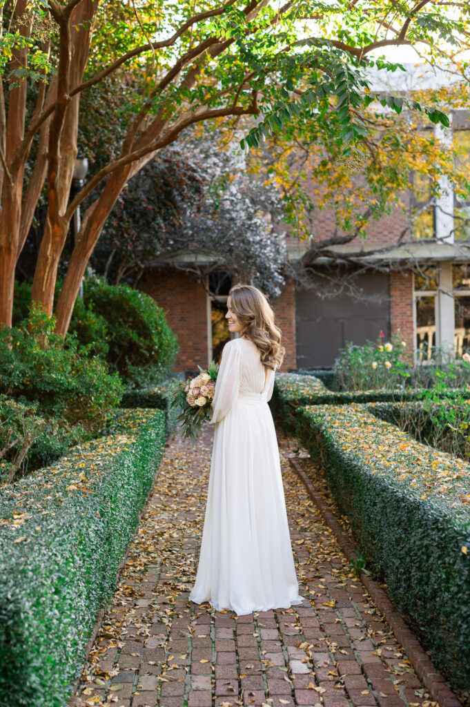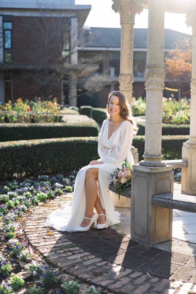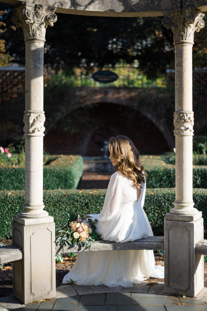 Even outside of peak bloom, the space still photographs beautifully. When the roses are more minimal, the garden’s structured hedges and pathways take on a maze-like story book feel, creating a different, but equally romantic backdrop. I photographed a winter bridal session here and despite the lack of roses, the winter light against the white pillars and green hedges provided a beautiful bridal backdrop.