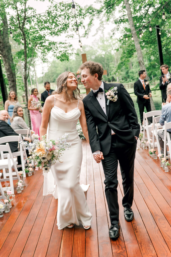 One of the most loved features of Piney Grove Ranch weddings is the option to host your ceremony beside the water. The bridal party walked down the grand stone steps onto the beautiful deck by the pond.